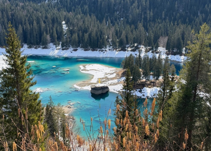 • Spektakuläre Aussicht: Blick auf den See umgeben von schneebedeckten Bergen und Kiefern