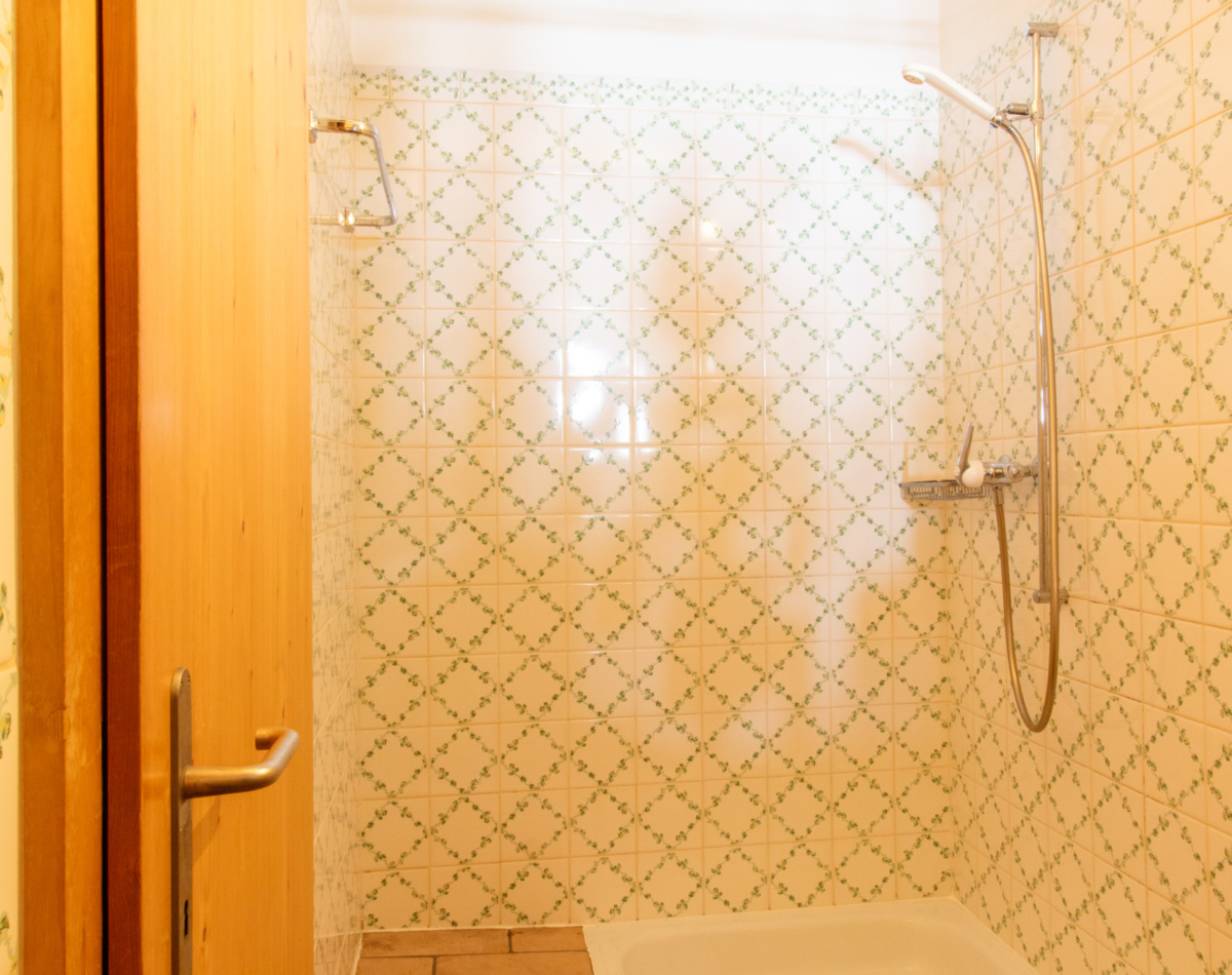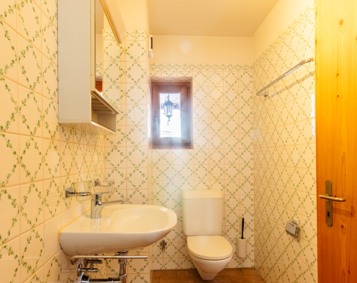 Bodenbeläge im Wohn- / Essbereich und in der Nasszelle sind durchgehend mit Tonplatten ausgelegt. Die Schlafzimmer verfügen aktuell über Teppichbelag.