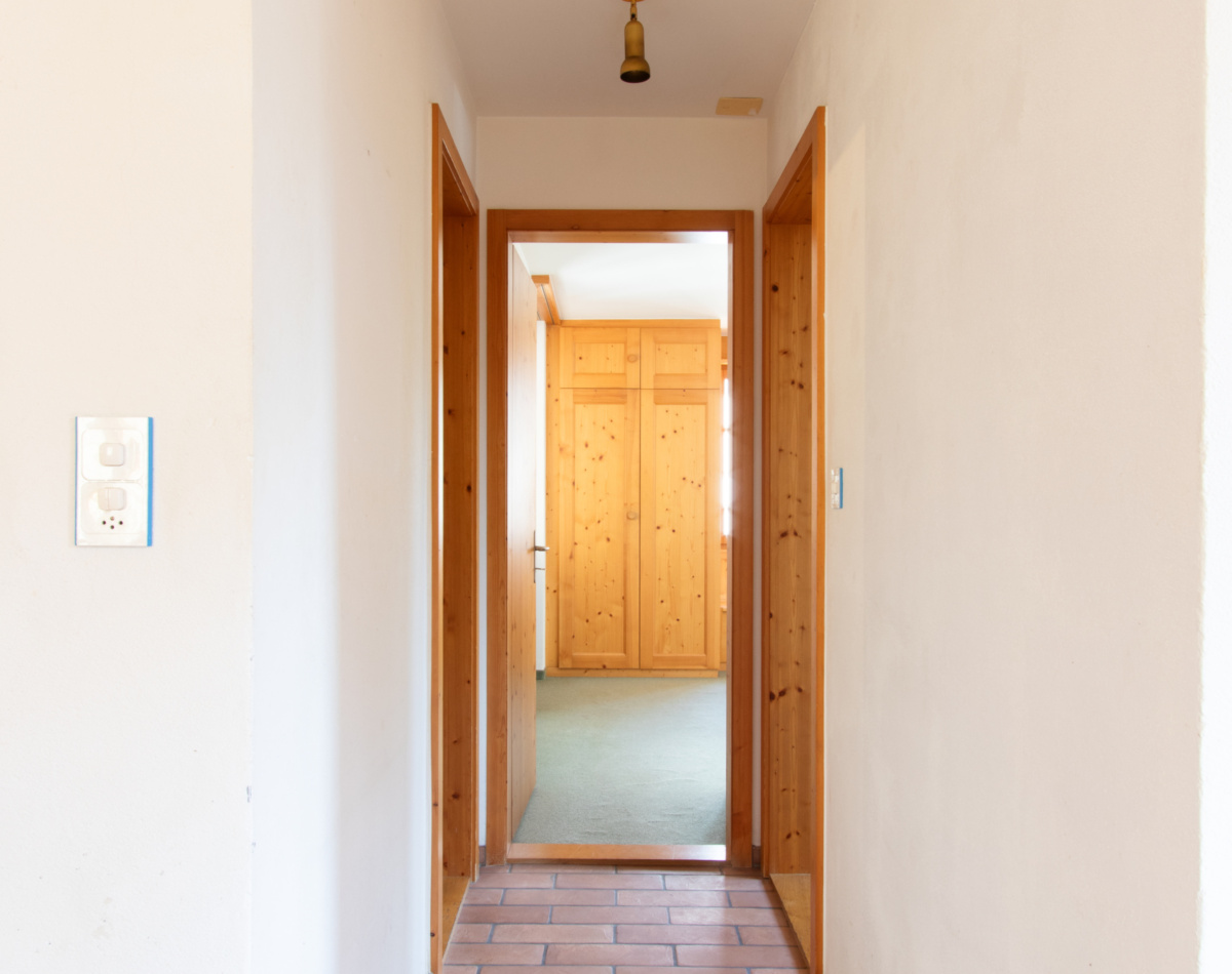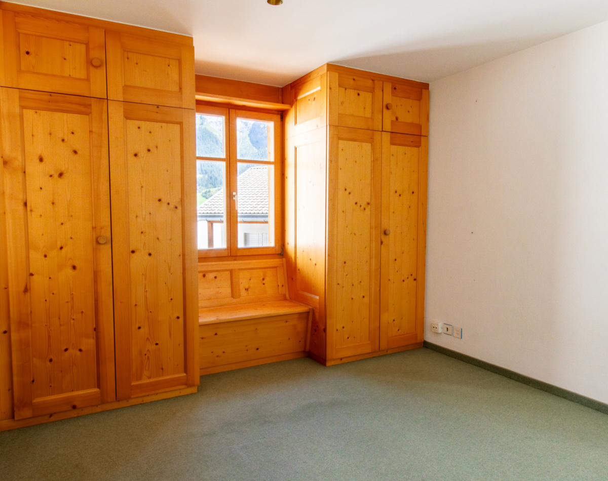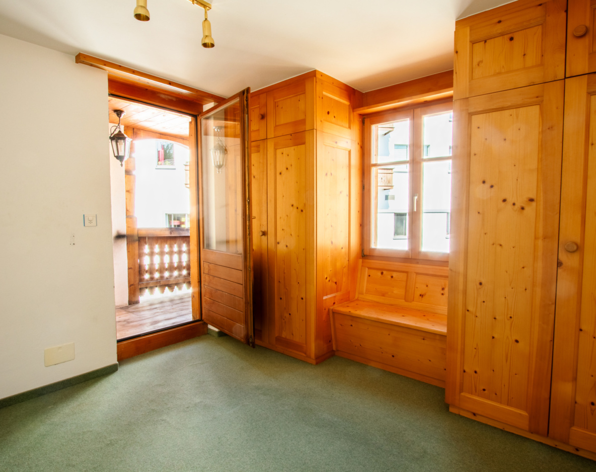 Die Schlafzimmer sind mit grosszügigen Einbauschränken ergänzt. Das grössere der beiden Schlafzimmer verfügt über einen direkten Zugang zum kleineren Balkon auf der Nordseite des Hauses. Die geräumige Nasszelle bietet eine Dusche, ein Lavabo, die Toilette und ein kleines Fenster. Dem Wohnzimmer vorgelagert befindet sich der grössere Balkon. Von hier aus hat man eine fantastische Aussicht Richtung Flims, den Flimserstein und die umliegende Bergwelt.