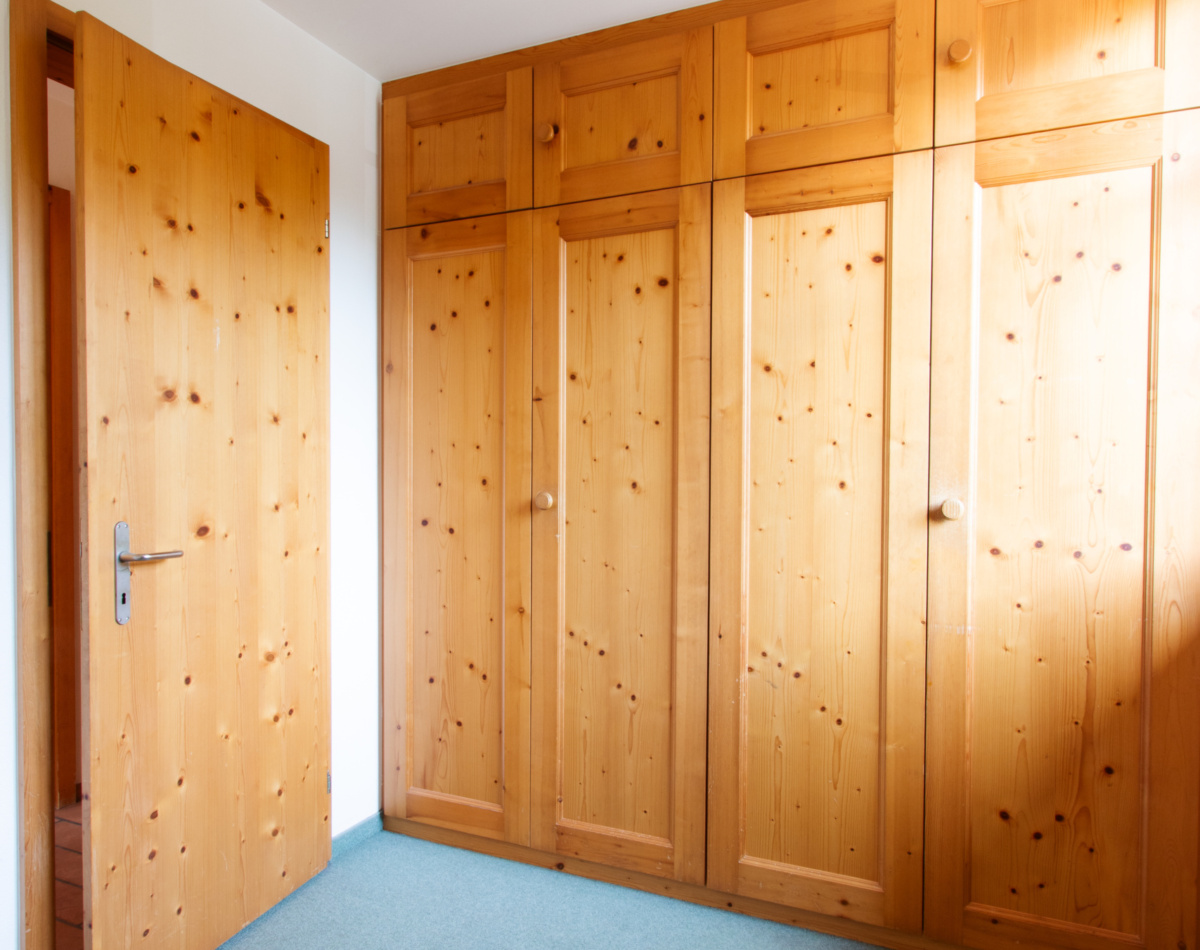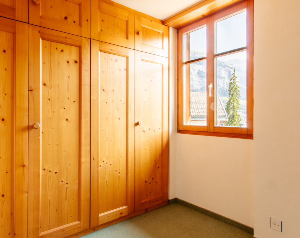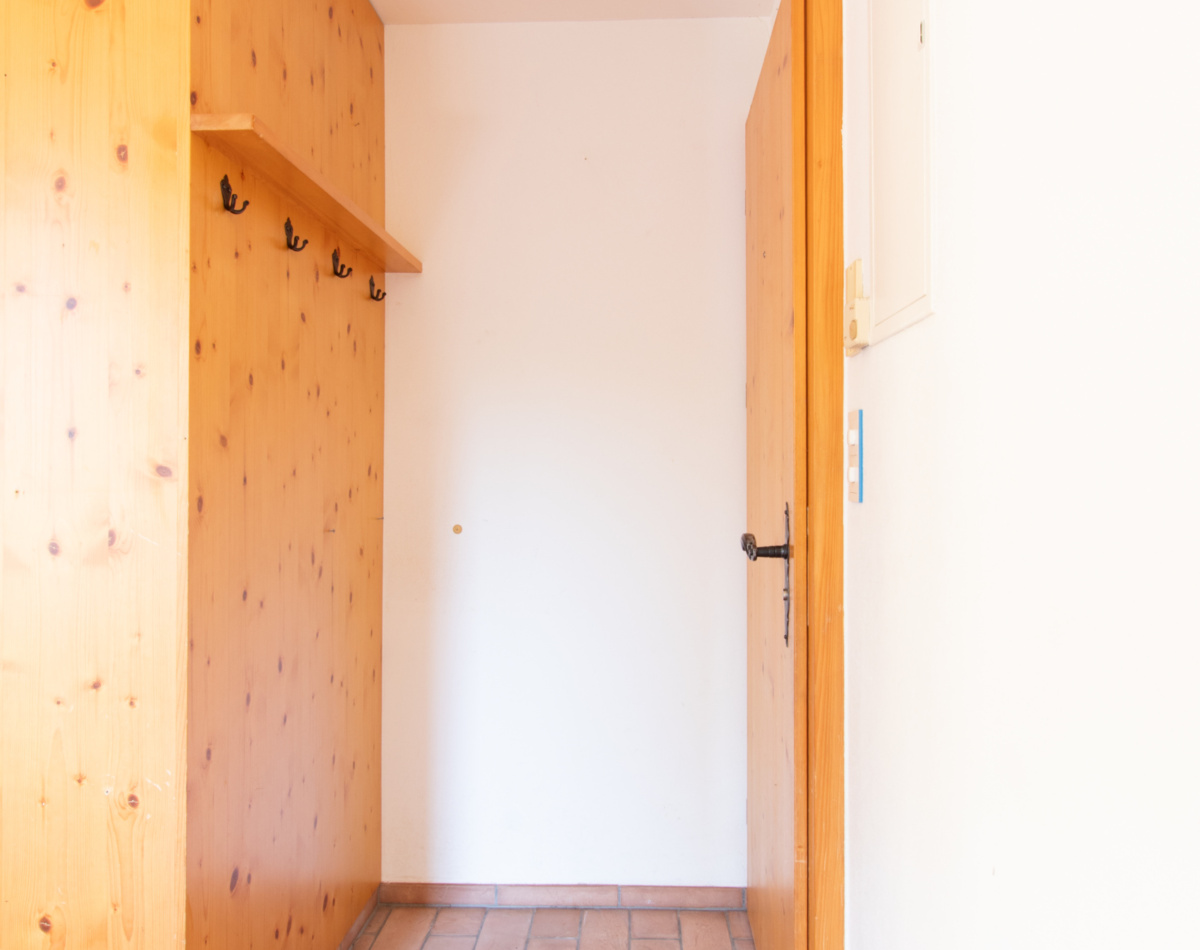 Die Schlafzimmer sind mit grosszügigen Einbauschränken ergänzt. Das grössere der beiden Schlafzimmer verfügt über einen direkten Zugang zum kleineren Balkon auf der Nordseite des Hauses. Die geräumige Nasszelle bietet eine Dusche, ein Lavabo, die Toilette und ein kleines Fenster. Dem Wohnzimmer vorgelagert befindet sich der grössere Balkon. Von hier aus hat man eine fantastische Aussicht Richtung Flims, den Flimserstein und die umliegende Bergwelt.