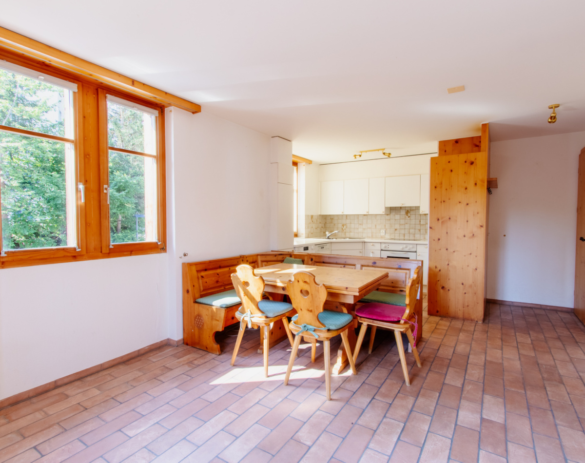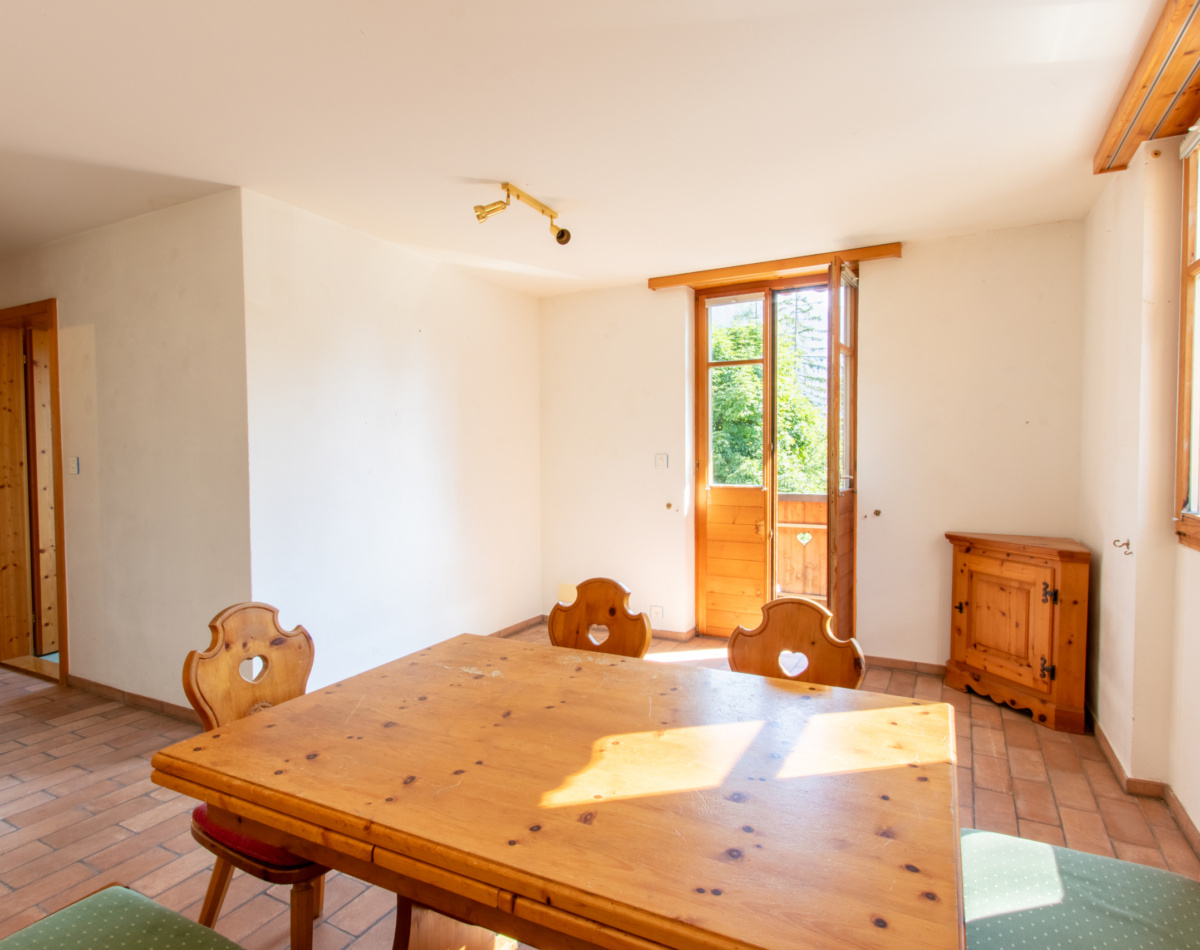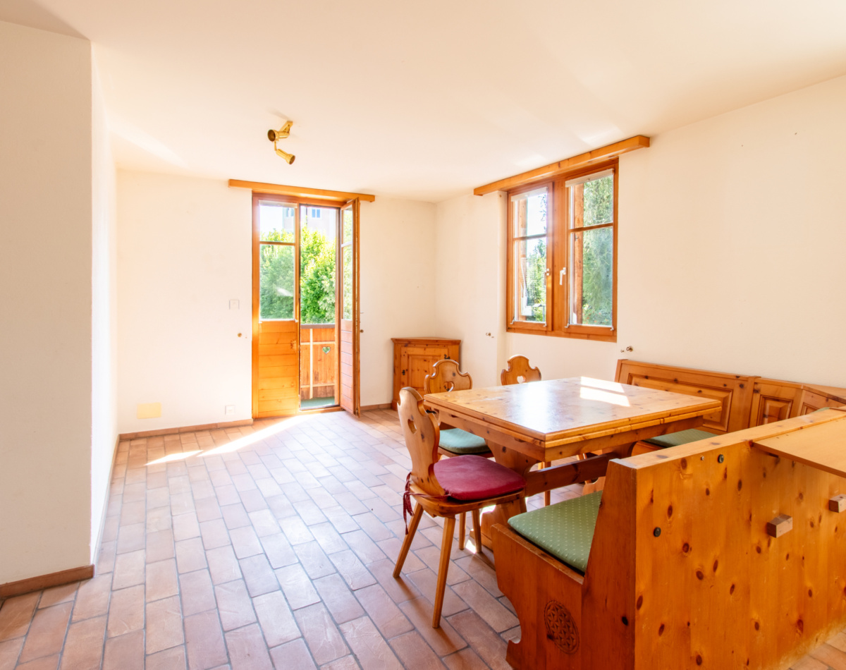 Die rund 50 m2 grosse 3.5-Zimmerwohnung ist hauptsächlich gegen Süd-Osten ausgerichtet. Der Wohn- und Essbereich ist äusserst geräumig und durch die zahlreichen Fensterfronten sehr hell. Von hier aus hat man eine fantastische Aussicht Richtung Flims und die umliegende Bergwelt bis hinauf zum Skigebiet und dem Crap Sogn Gion.